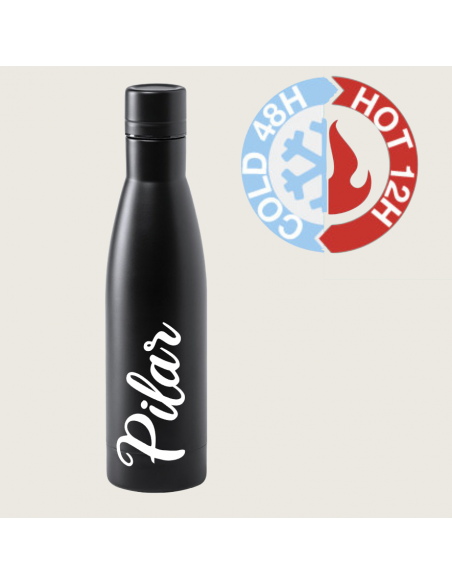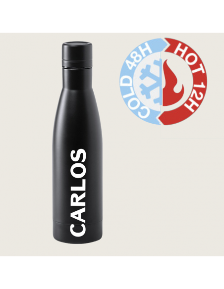 No olvide guardar su personalización para poder añadirla al carritoBidón térmico de acero inox, con doble capa y aislamiento de cobre al vacío. El mismo le permite mantener el calor y el frio durante un tiempo más prolongado, llegando a las 12 y 48 horas respectivamente. De 500ml de capacidad, y disponible en variada gama de colores metalizados.