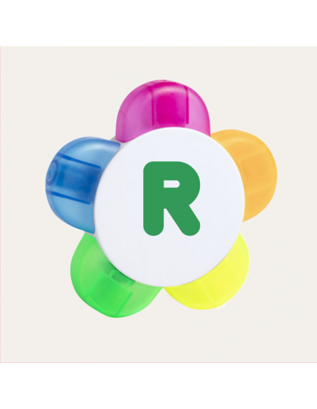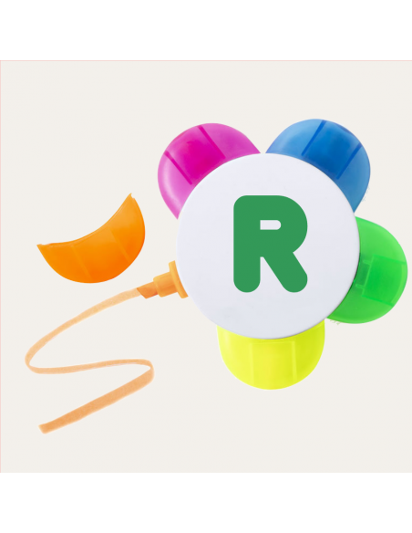 Set de marcadores en original diseño flor. Con amplia superficie de marcaje y subrayadores en colores naranja, azul, verde, amarillo y fucsia.