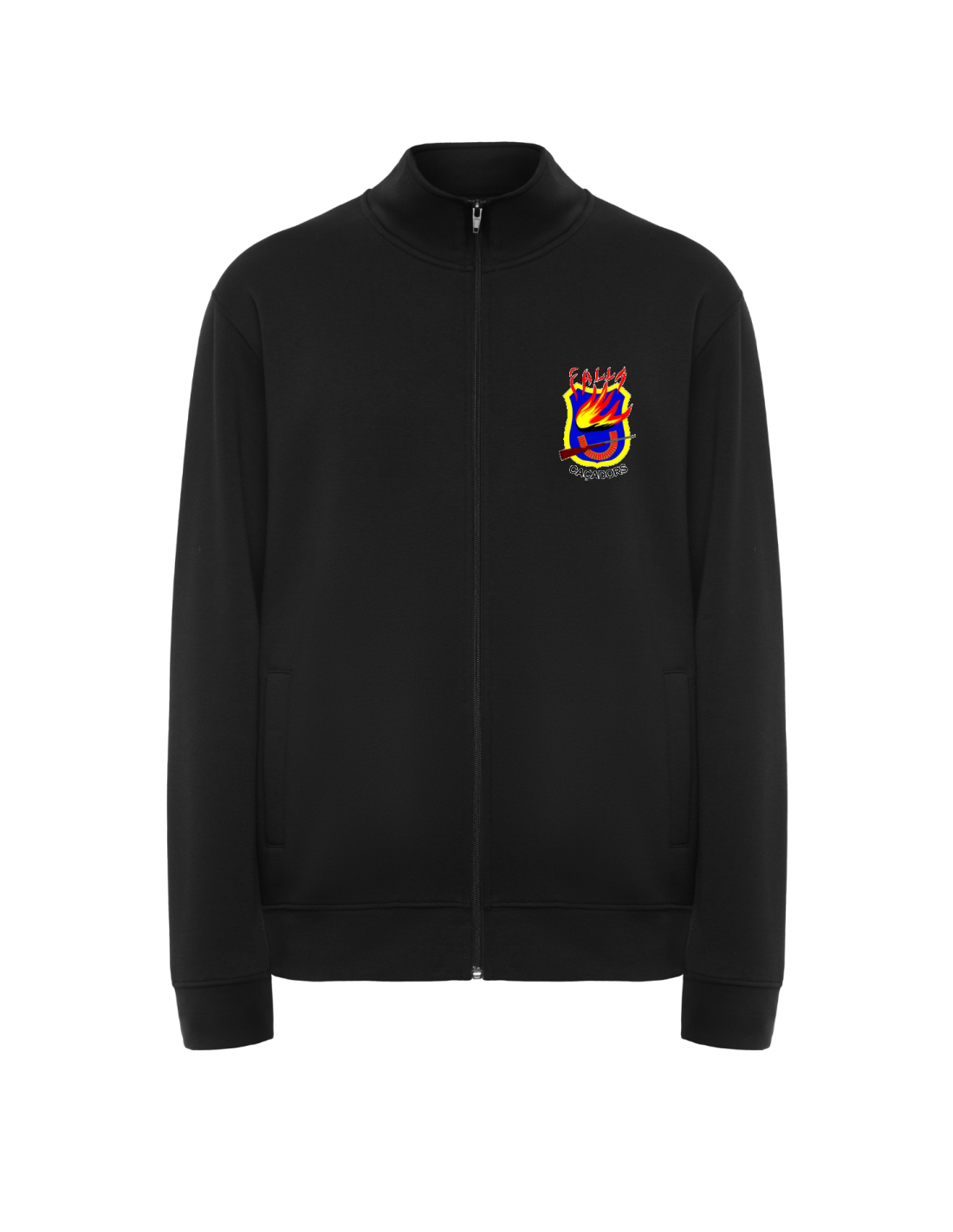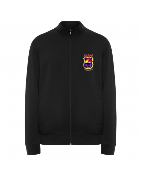 Sudadera unisex con cremallera frontal y cuello alto. Cremallera al tono. Dos bolsillos laterales con ribete del mismo tejido. Puños y cinturilla en canalé 2x1 con elastano. Cubrecosturas del mismo tejido.